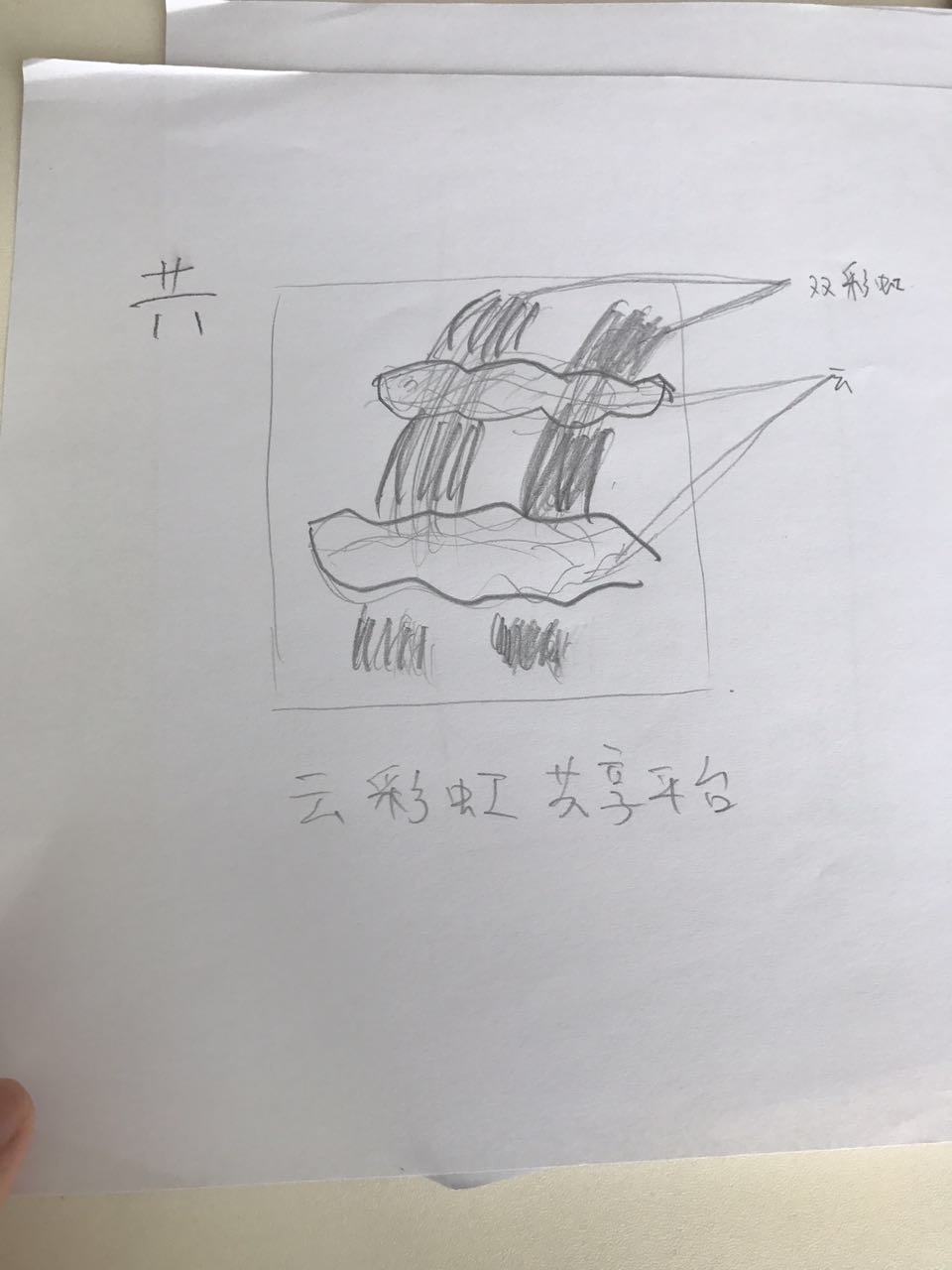主要想要的是作為app的logo,想突出共享這個概念, 其次再考慮云和彩虹,我個人覺得可以做成 “共” 字 兩朵云,一道雙彩虹,如圖: 云的形態(tài)做些適當?shù)男薷?,但大致要這個樣子