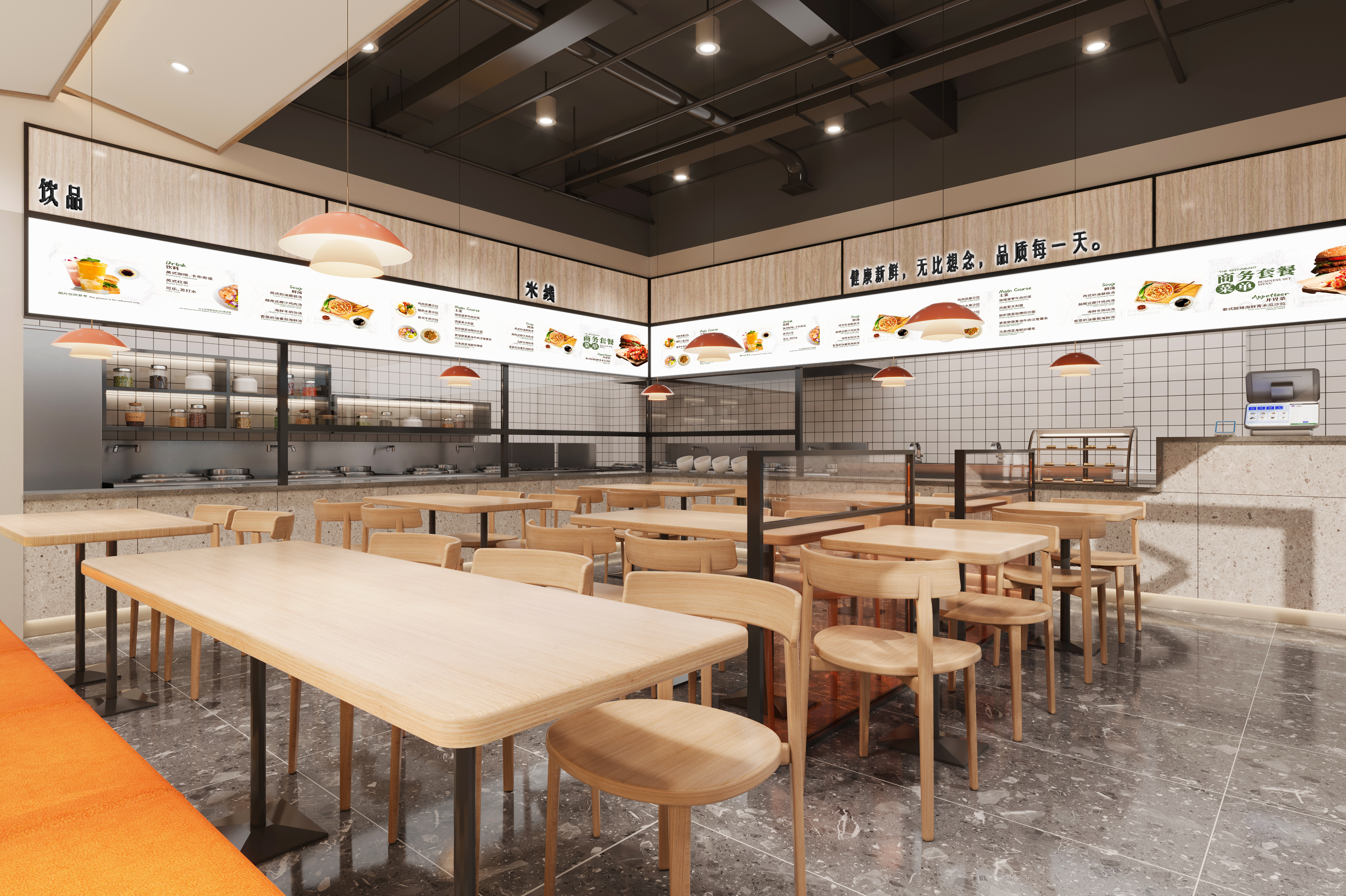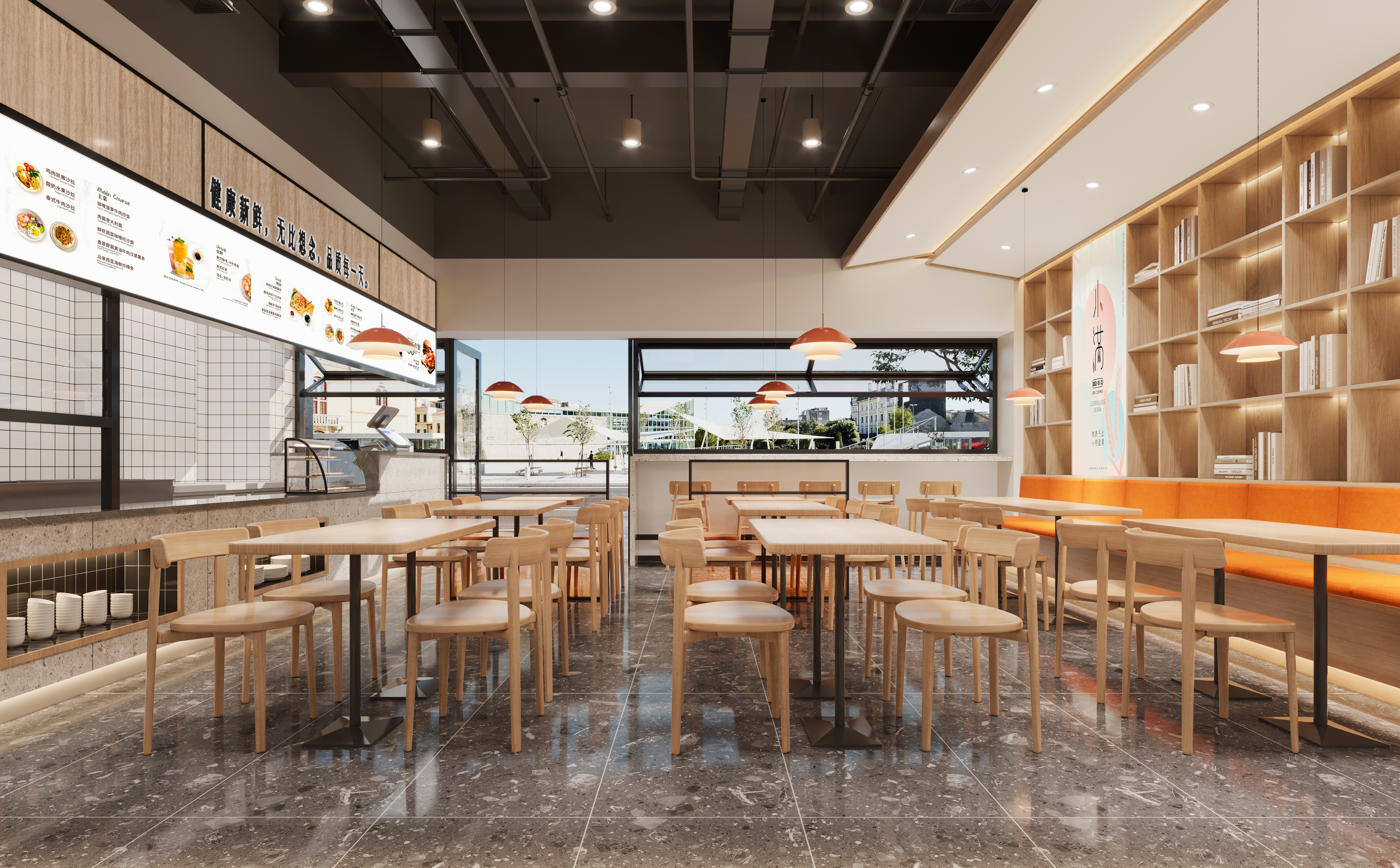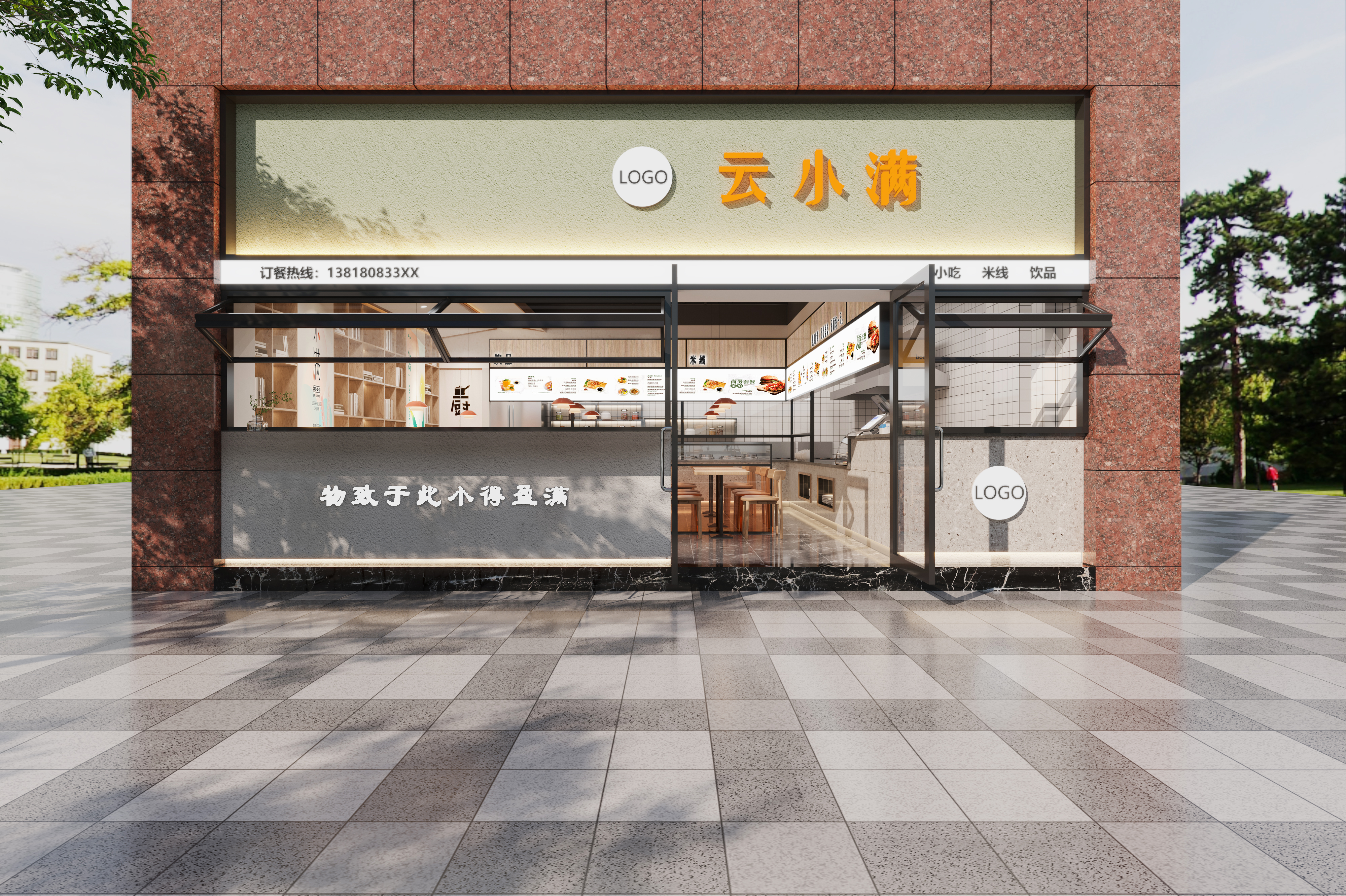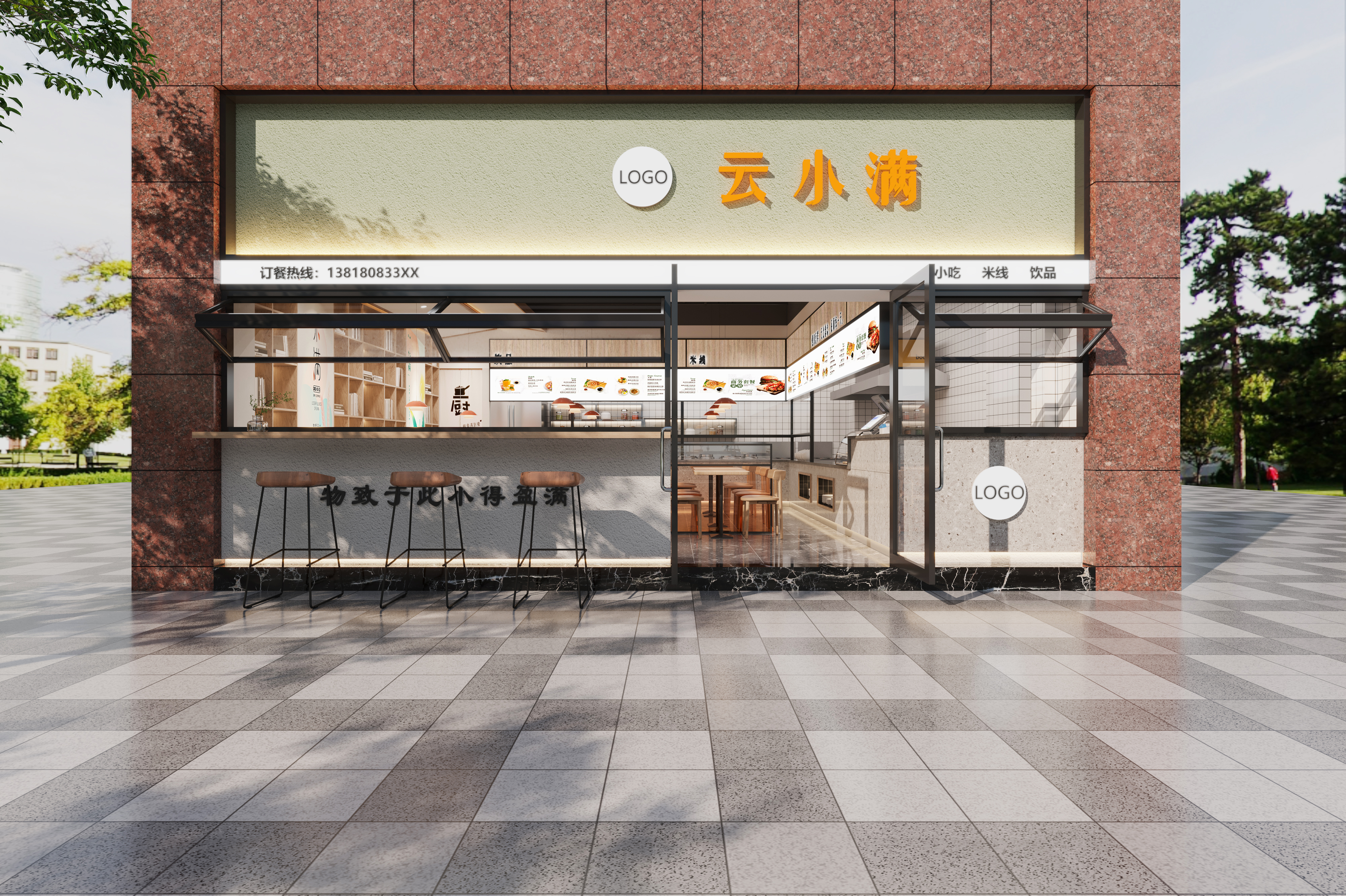 附件有門店裝修效果圖,結(jié)合現(xiàn)有色調(diào),以清爽簡潔風格為主。 突出余生小滿的字體設(shè)計效果再搭配餐飲元素